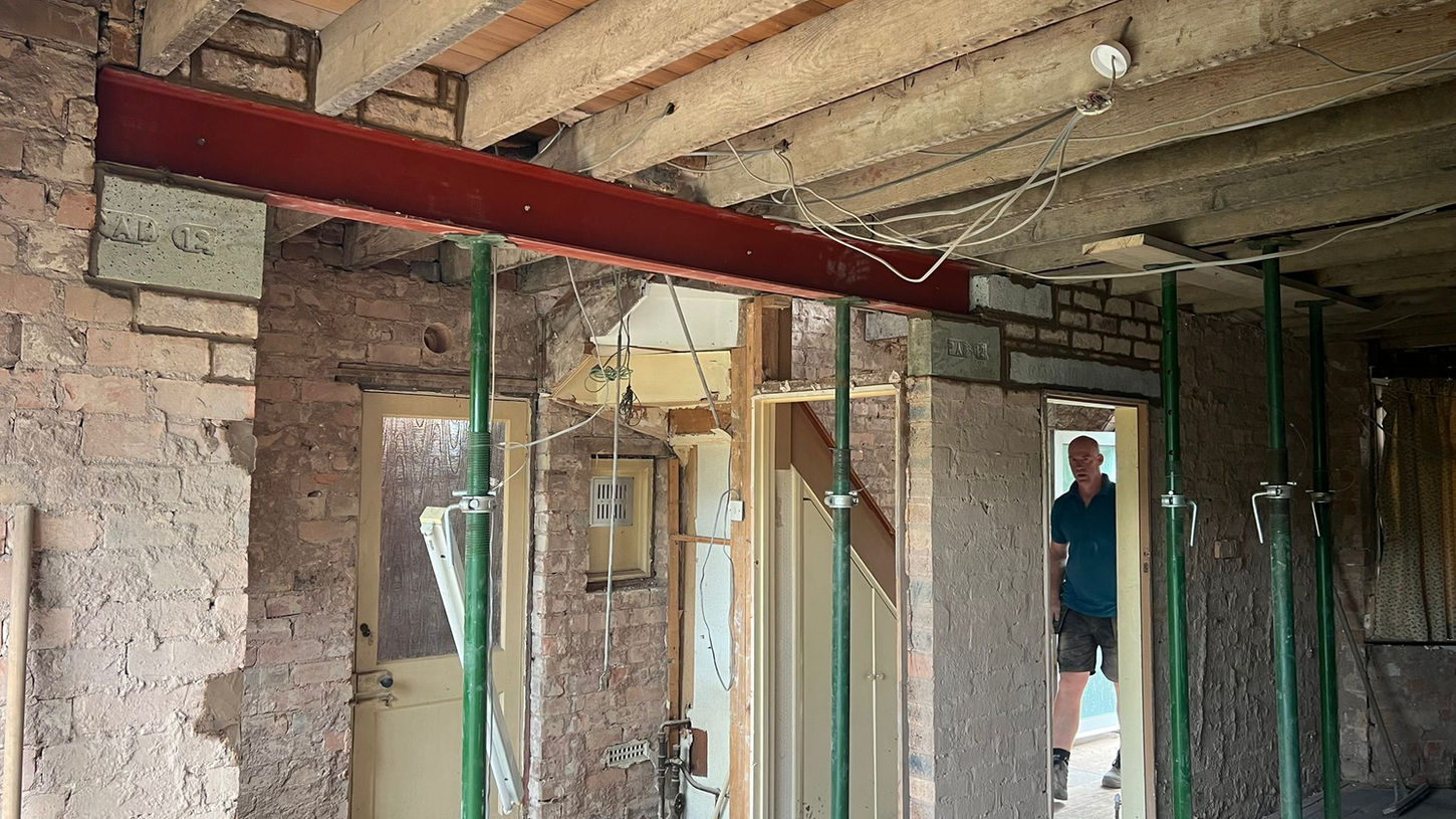 The project involved installing a 4.2-metre RSJ beam, arranging all temporary propping and Building Control liaison, and managing fabrication and fitting within two days.